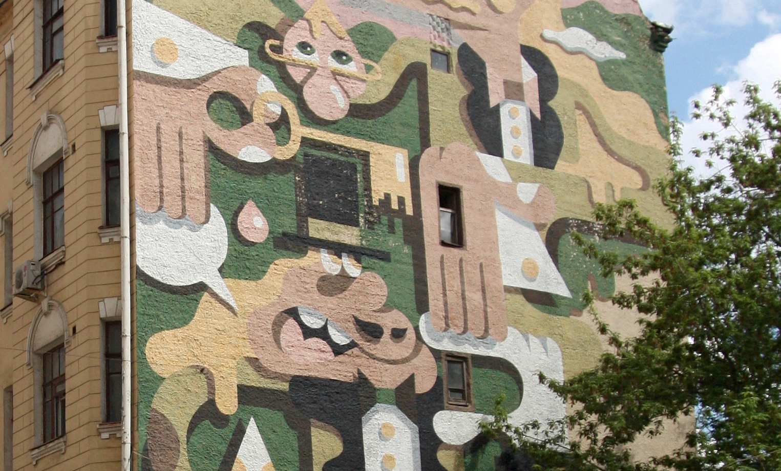 Говоря откровенно, создание масштабной стрит-арт работы, жизнь которой не будет ограничена тремя днями, сопряжено с бесконечным количеством согласований с инстанциями разного порядка. Именно поэтому многие художники участвуют в арт-программах. Так в рамках фестиваля «Лучший город земли» на Университетском проспекте, 9Б была создана эта работа.